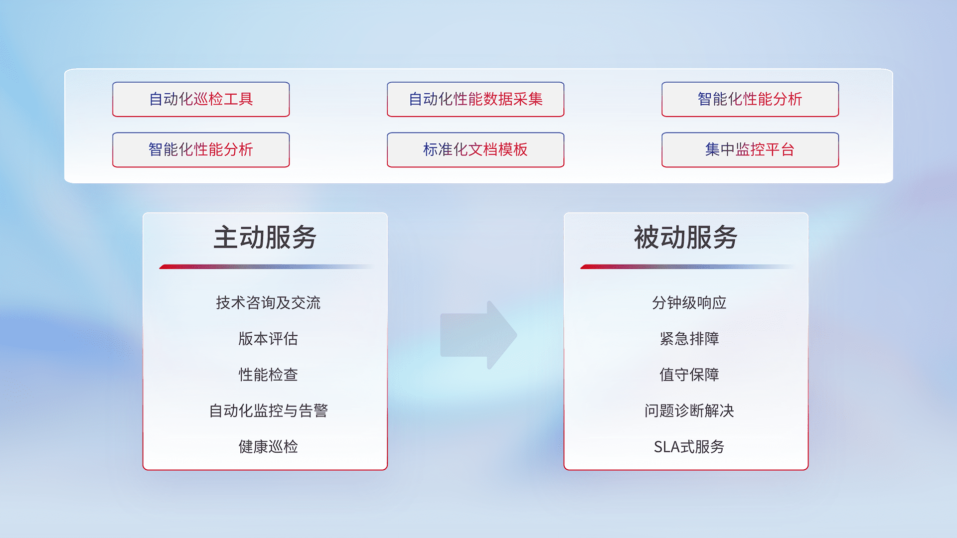 智能化工具和标准化文档,,保障服务质量,,提供主动服务(包含技术咨询、、、版本评估、、性能检查、、、、自动化监控与告警、、、健康巡检)和被动服务包含(分钟级响应、、紧急排障、、、值守保障、、问题诊断解决、、SLA服务)。。
